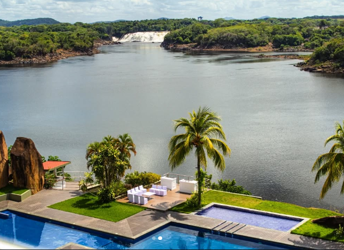 Riverside hotel perched on a dramatic rocky overlook above the Orinoco—famous for its scenic setting and even a guitar-shaped pool.